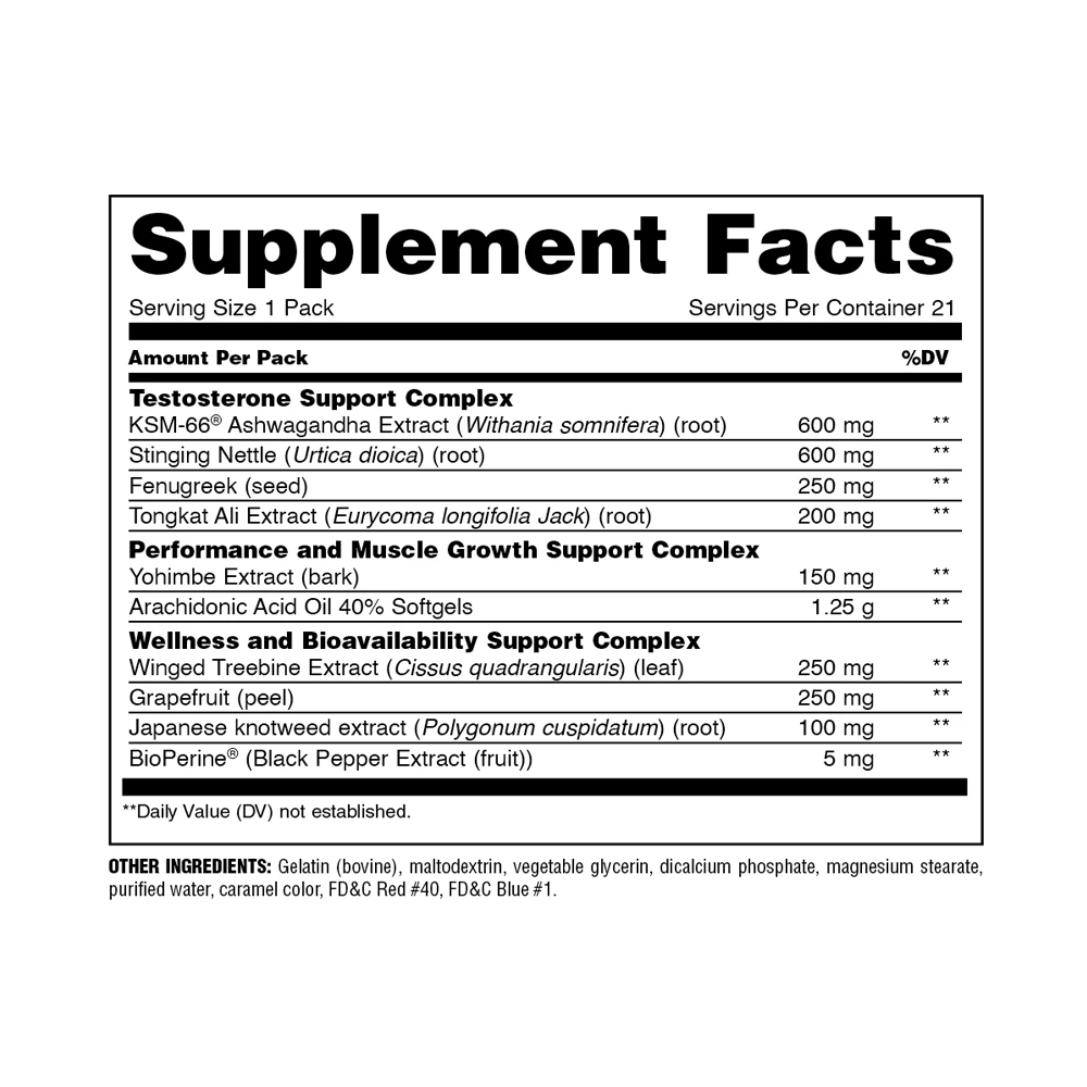 Break through muscle size plateaus with the complete testosterone boosting supplement for men. Animal Test supports 4X greater testosterone increase with KSM-66® Ashwagandha to help create more muscle mass. Our complete all-in-one, convenient grab-and-go, testosterone booster pack is formulated for strength athletes, bodybuilders, powerlifters, and individuals striving to push their gains to new heights. Benefits Supports increased muscle strength, size, and performance Works to increase both testosterone output and utilization Aids in workout recovery, joint health, and growth of muscle tissue