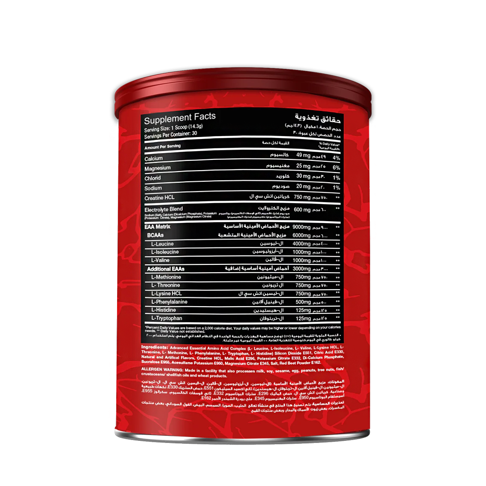 EAA + Creatine HCL is a full spectrum EAA profile consisting of all 9 Essential Amino Acids and muscle building Creatine HCL. Each serving delivers 6G's of BCAAs making this a superior, advanced recovery, intra and post workout product compared to the stand alone BCAA supplement. Researched Proven 2:1:1 Ratio Of BCAAs: Branch Chain Amino Acids Leucine, Isoleucine and Valine supports helps prevent muscle breakdown during workouts, muscle repair and aids in post-workout recovery. Lean Muscle Growth: When taken intra-workout or post-workout, EAAs have been shown to increase muscle protein synthesis, leading to better gains in lean muscle growth and recovery. Using Creatine HCL Can Help With: Requires a lower dose than Creatine Monohydrate Does not require a “loading cycle” Faster absorption Increased body mass Faster muscle recovery Reduced fatigue Relatively faster gains in strength