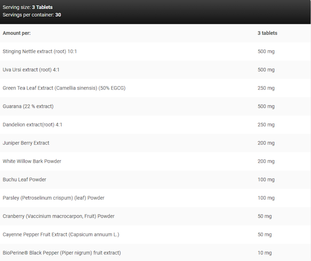 Ingredients: bulking agents (E460(i), E341), tribulus terrestris fruit extract (Tribulus terrestris L., 60% saponins), L-arginine, rhodiola rosea root extract (Rhodiola rosea L.; 3% rosavins, 1% salidrosides), stabiliser (E1202), ginseng root extract (Panax ginseng C. Meyer; 80% ginsenosides), damiana leaf extract (Turnera difusa Wild. J), fenugreek seed extract (Trigonella foenum-graecum L.), oat leaf & stem extract (Avena sativa L.), zinc sulphate, epilobium parviflorum herb extract (Epilobium parviflorum Schreb.), cayenne pepper fruit extract (Capsicum annuum L.; 2% capsaicin), muira puama root extract (Ptychopetalum olacoides Benth.), ginkgo biloba leaf extract (Ginkgo biloba L.), maca root extract (Lepidium meyenii), sodium borate, sodium selenite, anti-caking agents (E551, E470b), glazing agent (E1521), firming agent (E464).