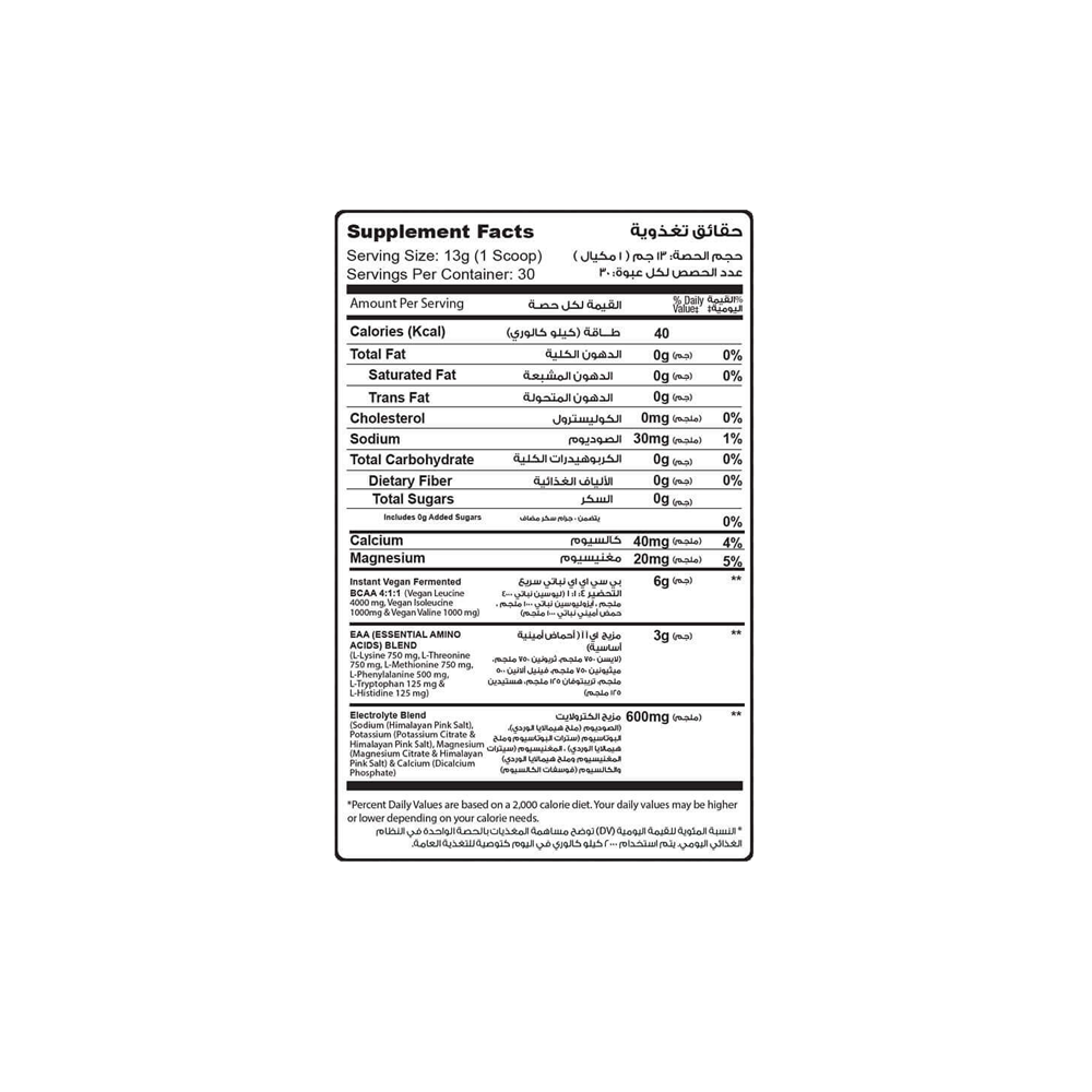 6 g of vegan BCAAs (4000mg of Leucine - 1000 mg of Isoleucine - 1000 mg of Valine) all in vegan form.