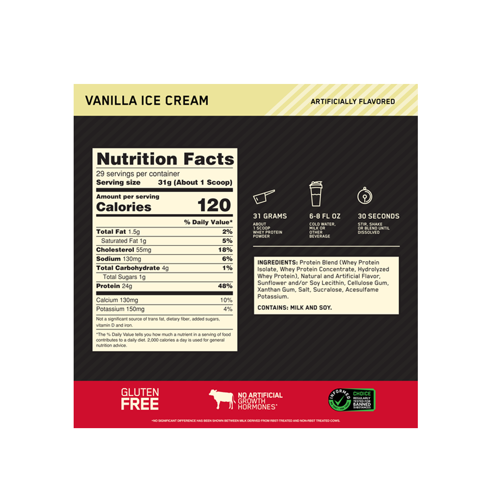GOLD STANDARD 100% WHEY™ Protein powder supports muscle and post-workout recovery with 24g of quality protein and 5.5g of naturally occurring BCAAs per serving.