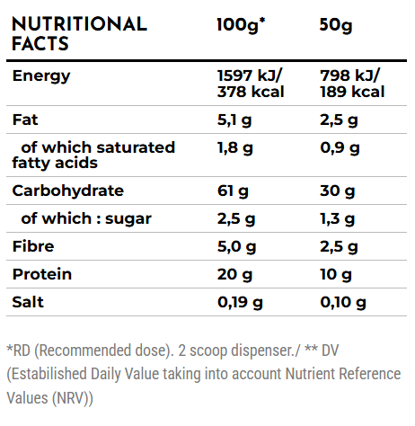 Mix 100 g (2 scoops dispenser) with 400 ml of water, milk, etc